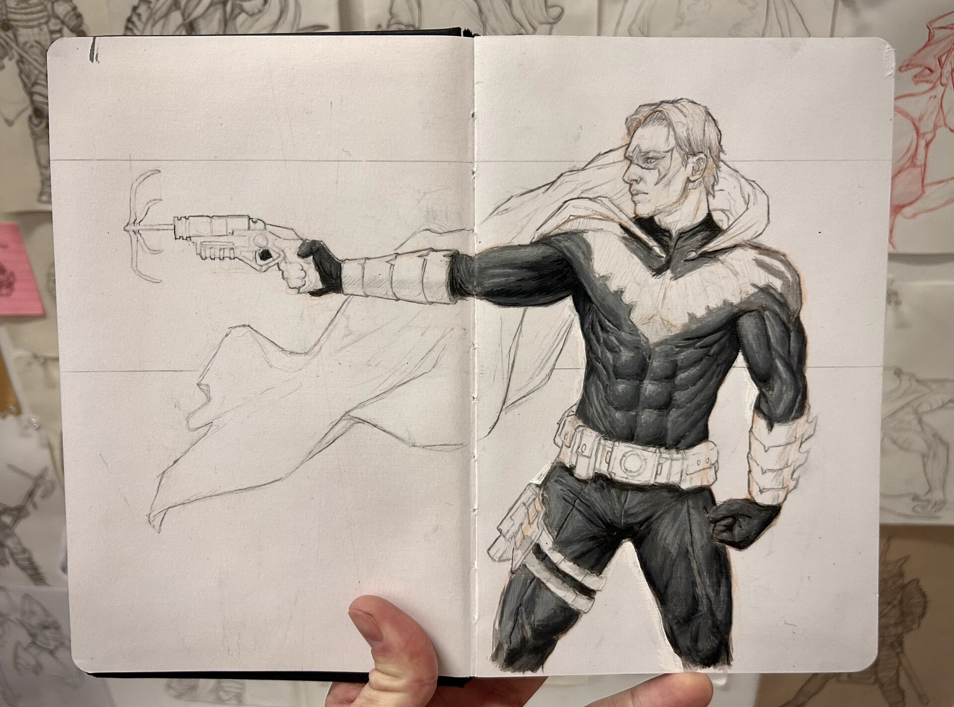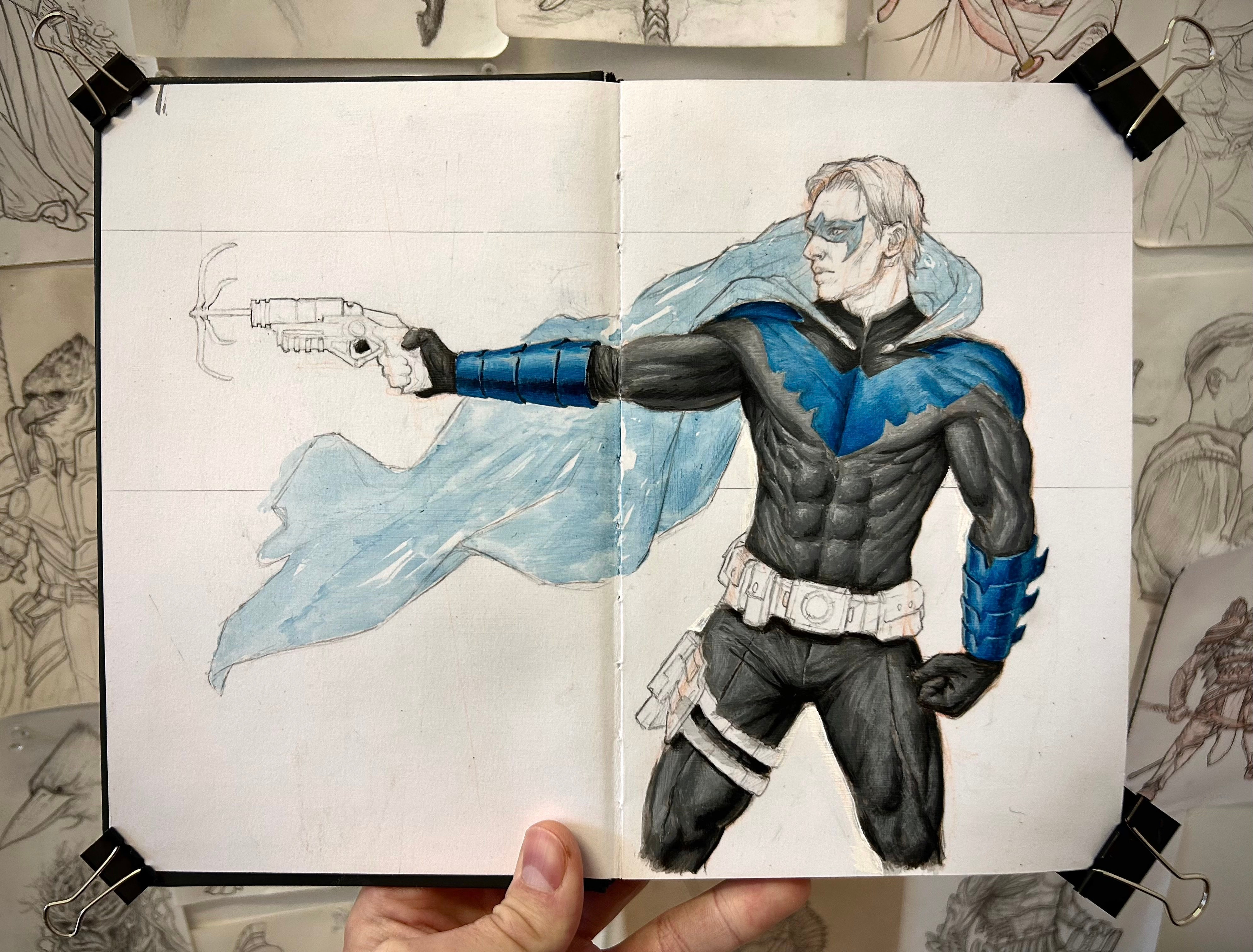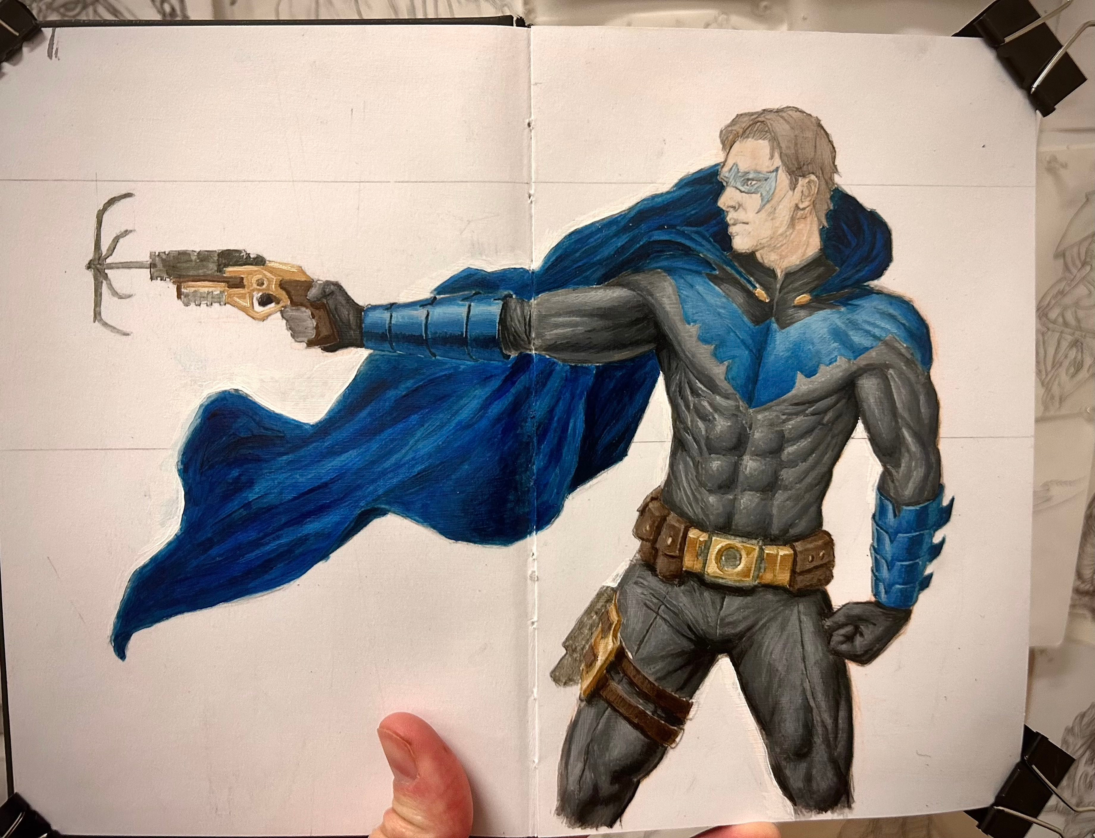 Paint sketch of Nightwing using fluid acrylics Mike Bakker